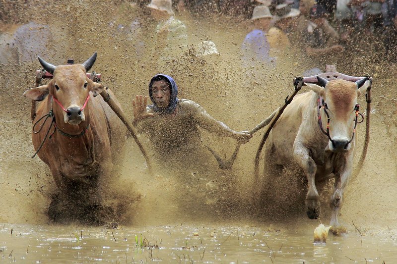 Гонки на быках по залитым водой рисовым террасам на острове Суматра (Индонезия)