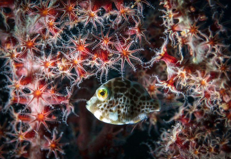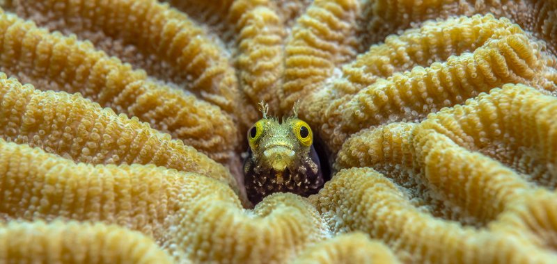 All his life, Blenny fish watching the world from his cozy mink in the brain coral. It could be dangerous outside... a house is a sweet house