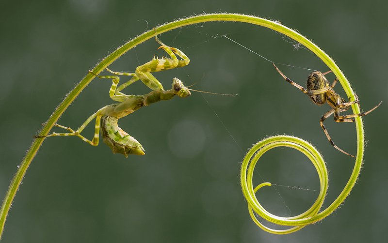 I was wandering in a wild area in my native town when I noticed a spider and a praying mantis both on the same branch. But they were calm. I set up my tripod and focused on the perfect location for my composition. I was lucky to catch an amazing moment as the praying mantis was chasing the spider and the spider was running on the branch to save his life. . I got a chance to capture this precious moment. I put my camera on a tripod and used manual focus with rim lighting with my Nikon D5200 camera body and a Tamron 90mm Macro lens. This image is taken in my native town, Islamabad, Pakistan.