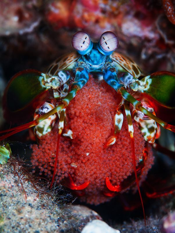 Рак-богомол с кладкой икры, которую он носит с собой. К тому же раки-богомолы,или мантиссы, обладают самыми сложно-устроенными глазами в животном мире. Филиппины. Анилао.