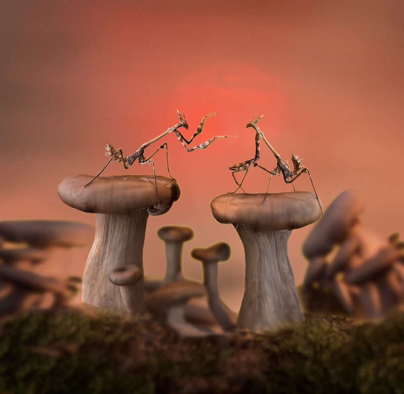 Этого богомола я заметил еще до восхода.Как только солнце показалось из-за горизонта он начал движения,словно дирижёр утреннего оркестра,встречающего рассвет. This mantis I noticed before sunrise.As soon as the sun appeared from behind the horizon, he began to move,like a kapellmeister of a morning orchestra,meeting the dawn.