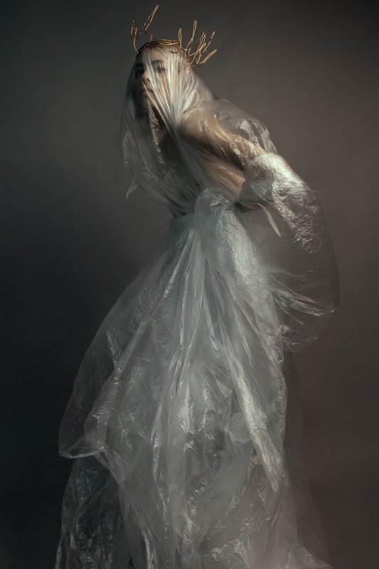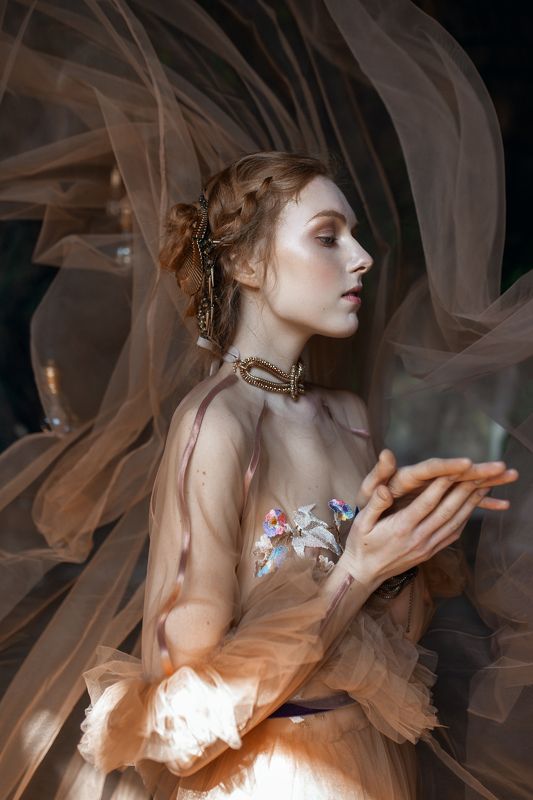 Serie was inspired by the idea of a set of dresses from the fairytale by Charles Perrault "Donkeyskin". According to the plot, the princess wanted to avoid unwanted marriage and decided impossible tasks to the groom, namely, to make a dress of the color of the sun, the moon and the starry sky. The groom fulfilled these tasks and the princess had to flee. She settled herself as an assistant to a village peasant, and one night after a day's work the princess decided to please herself and tried on all her dresses. Is is this contrast between the simplicity of the shack and dresses from the best fairy-tale designers that served as inspiration for the realization of this shooting.