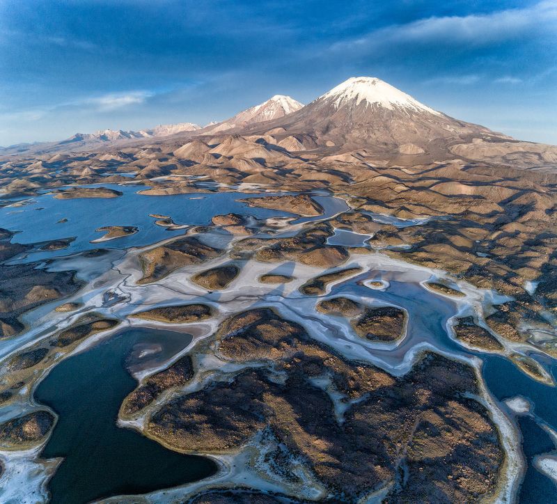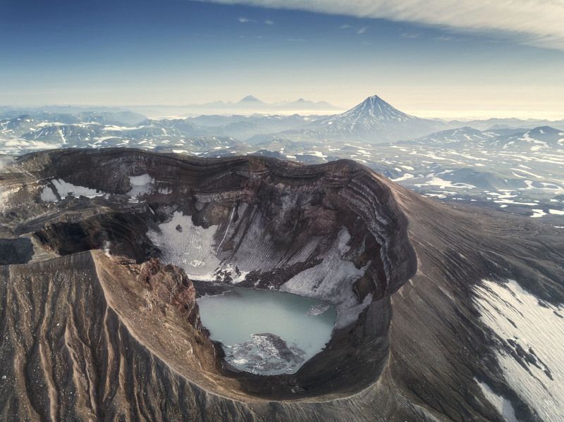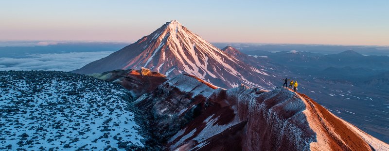 Для того, чтобы подняться на вулкан на рассвете, мы начали восхождение в час ночи из базового лагеря. Успели за полчаса до восхода солнца, передохнули, попили чай и край солнечного диска показался из-за горизонта. У меня было несколько минут. Дрон помог мне выбрать такой ракурс, который не получить иным способом. Соседний вулкан Корякский залило рассветными лучами и я подбежал с пультом в руках к друзьям, любующимся открывшимся видом. Был сильный ветер, до 16 метров в секунду в порывах, но аппарат выдержал испытание.