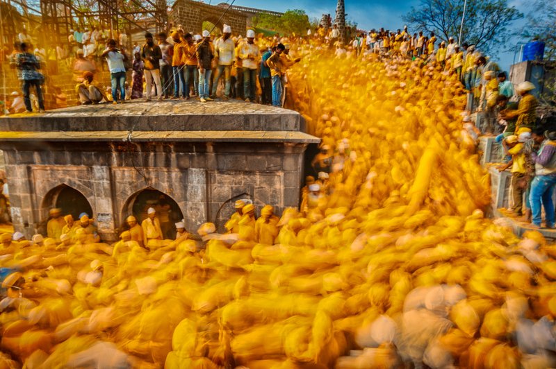 The festive mood is electrifying. Young kids, who throw turmeric ( haldi ) powder at each other, also drag visitors into the celebration. Sri Keloba Rajabau Waghmode, the ‘Baba’ is all drenched in turmeric, of the devotees, who walks for over 17 days from his village to reach Pattan Kodoli for the festival every year. He ocassionaly gets into trance dance and tells the fate of village, predicts rains. The whole comunity joins in the tantrik dance, the whole atmosphere is covered in yellow dust of turmeric.
