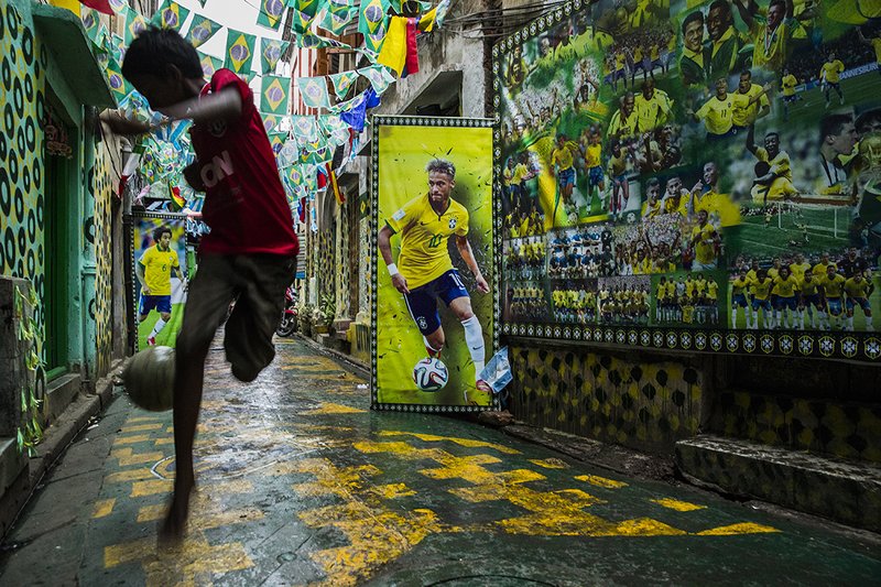 Most of the people of KOLKATA support BRAZIL at the time of world cup football . The shot was taken during last world cup football , 2018 , where one of the street of KOLKATA was designed like a mini brazil along with the figures of famous players . when i visited that narrow alley saw that boy ,who was trying to do the football skills like their heros .