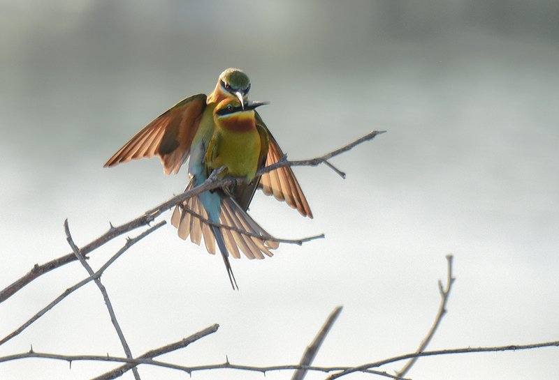Spot-billed pelican Usually they catch fish while swimming on water surface by using the pouch of the beak. This occasion was captured when a pelican tried to hunt for a fish while flying.( like Terns, King fishers or eagles do). Sri Lanka