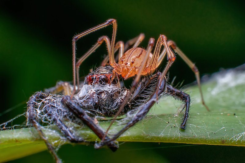 Spitting Spiders(Scytodes venusta) preys on Two-striped Jumping Spider (Telamonia dimidiata)