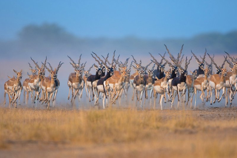 It was a winter evening at Velavadar when I was in search of an Indian grey wolf. But I have not expected to see the predator along with the prey. Generally this kind of chase happened in the early morning. But suddenly on that evening I found a kind of dust storm was coming towards me from the far end of the grass land. Then i understood that a group of antelopes were running together which creates the dusty background . It looked like a race. It was a race of death. Whoever wins the race will get his "life" as a prize. The group of Black bucks was been chased by the hunter & the hunter was none other than an Indian Grey Wolf. On that day one male Black buck lost the race & was killed by the deadly predator.