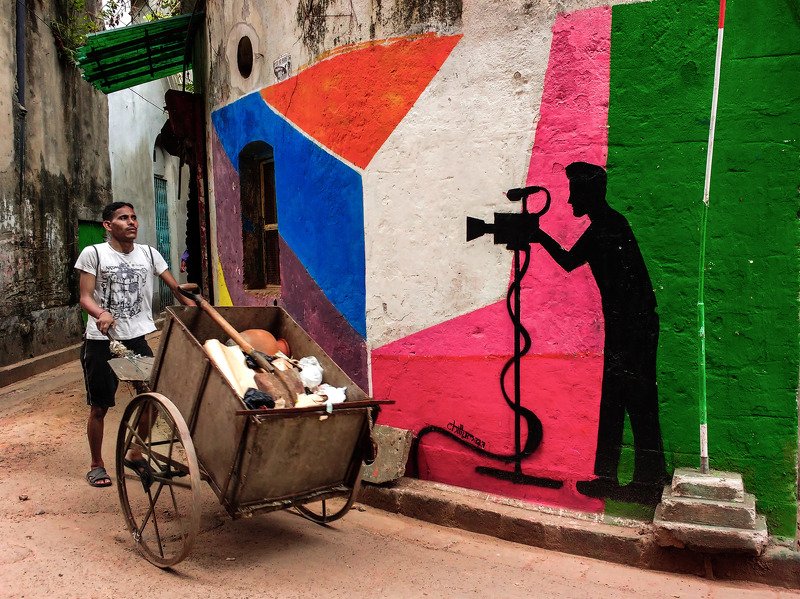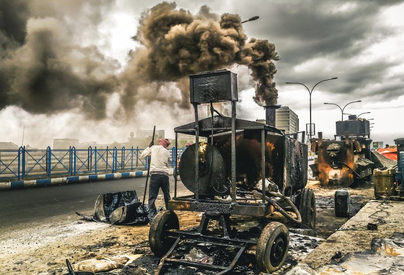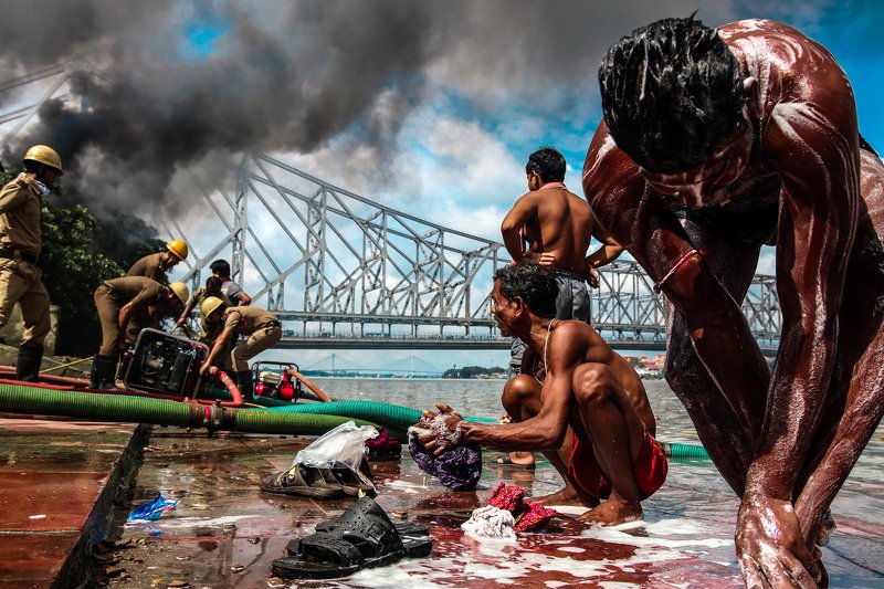 The iconic Rabindra Setu (Howrah Bridge) is the vein that connects two hearts of the cities Calcutta and Howrah which is separated by the river Ganga. Millions of people depend on the river water for their daily hustle. Here, a man walks back to the river bank taking a dip in the water after a day's work.