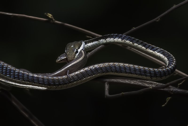 Taken at agumbe rain forest. went there for in search dog, after roaming around everywhere sat on a rocky platform and leaned on tree. Suddenly I realized something moving just above my head, I looked at there and spotted this beautiful vine snake. Basically it was it's den and I was the intruder.