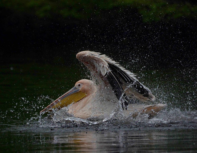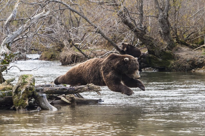 Медведь в полете. Ловля нерки требует сноровки - в том числе элементов акробатики. Камчатка, река Хакыцин.