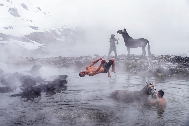 Budaklı thermal spring, which is located in Budaklı village, 7 kilometers from Güroymak district of Bitlis, welcomes local and foreign tourists seeking healing, especially in the summer, with its water at 40 degrees, it becomes a haunt of buffaloes and horses in winter. In the village where the winter is harsh, the animals that are contaminated are not taken out of the stables, and they are taken to the spa at certain intervals to be cleaned by their owners. In the village, where the air temperature drops below 20 degrees below zero, the breeders who float their animals in the spa under the cover of the snow enjoy swimming in warm and healing water.