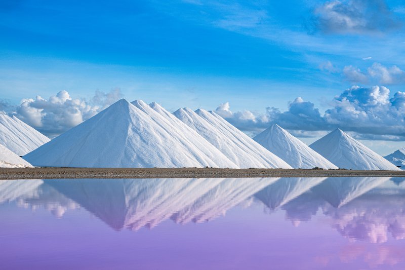Горы бывают разные, но все они по своему прекрасны. Соль всегда была одним из важнейших ресурсов небольшого карибского острова Бонейр. 200 лет назад ее добывали рабы, сейчас их место заняли машины. Соль выпаривают из озер и насыпают в такие вот блестящие в солнечных лучах горы. Потом ее грузят на корабли и отправляют в самые разные части света. Озера же, в которых отражаются горы, населены мелкими красными рачками, которые придают розовый цвет как воде, так и обитающим на этих озерах фламинго.