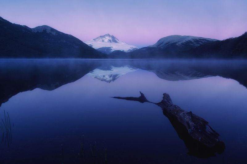 Hora previa al amanecer sobre la laguna Ilón. La noche le va dando paso a las primeras luces mientras las aguas condensan sus vapores y los colores del cielo enmarcan el cerro Tronador de fondo.