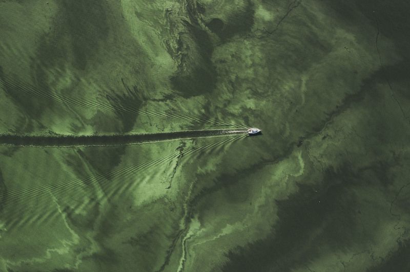 Cruise on Lake Turawskie in Poland. The lake is full of cyanobacteria every year. The water is green and the dense rug of water makes a surreal pattern with passing boats