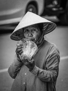This photograph was taken in Vietnam in 2021 during the lotus blooming season. An elderly woman soaks in water as she breaks each stalk of water lily to sell at the market. That solemn expression left an indelible impression on me.