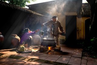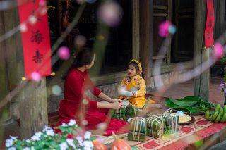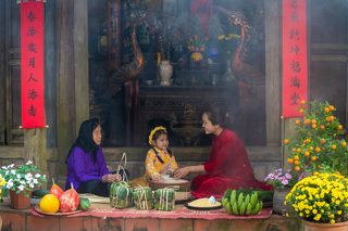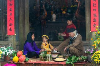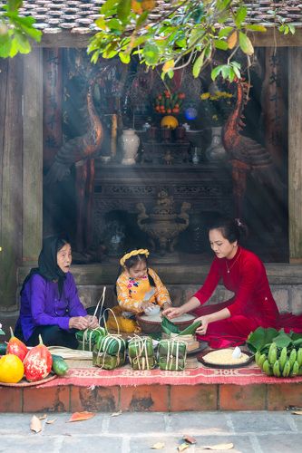A Vietnamese family is packing chung cake to celebrate the Lunar New Year