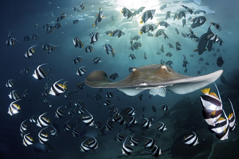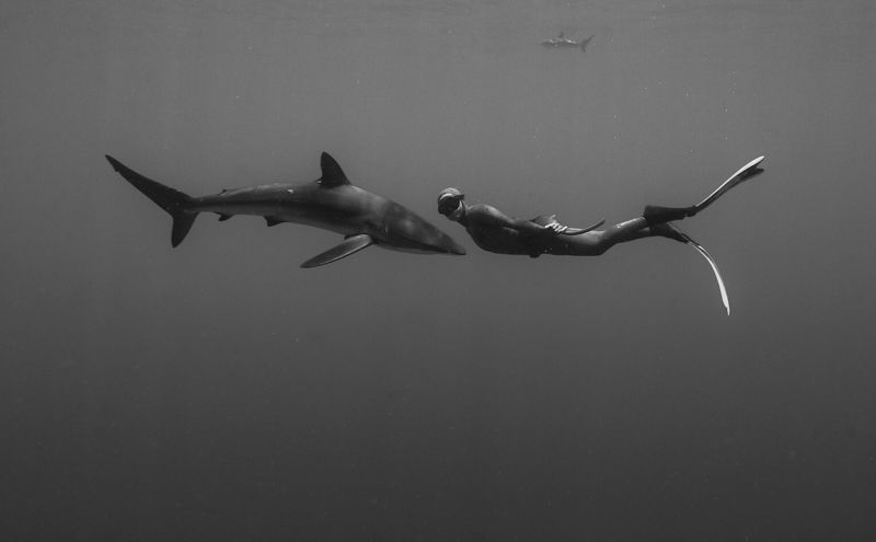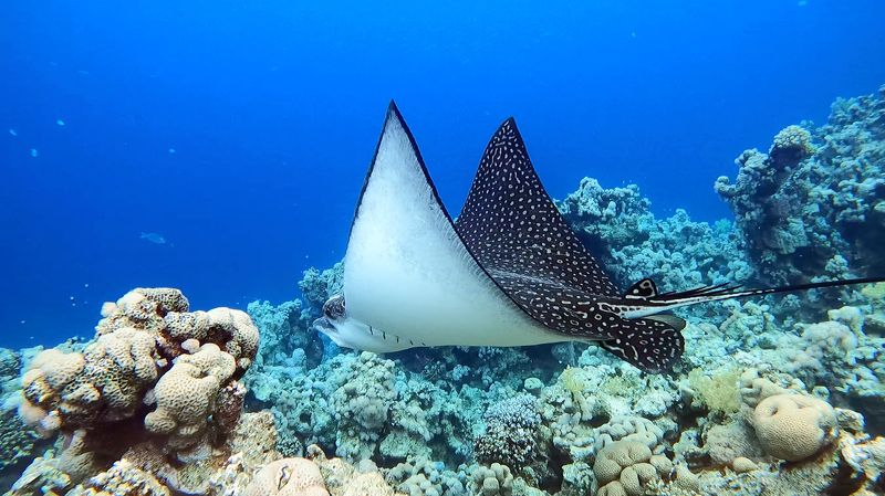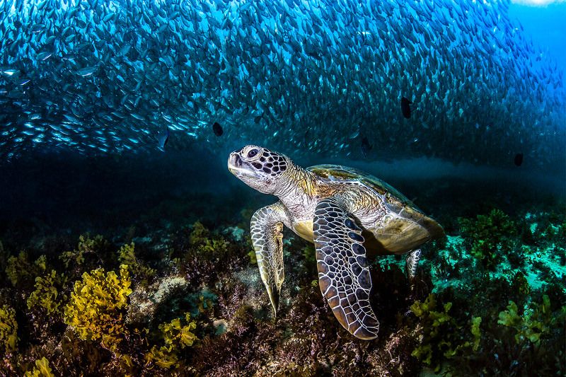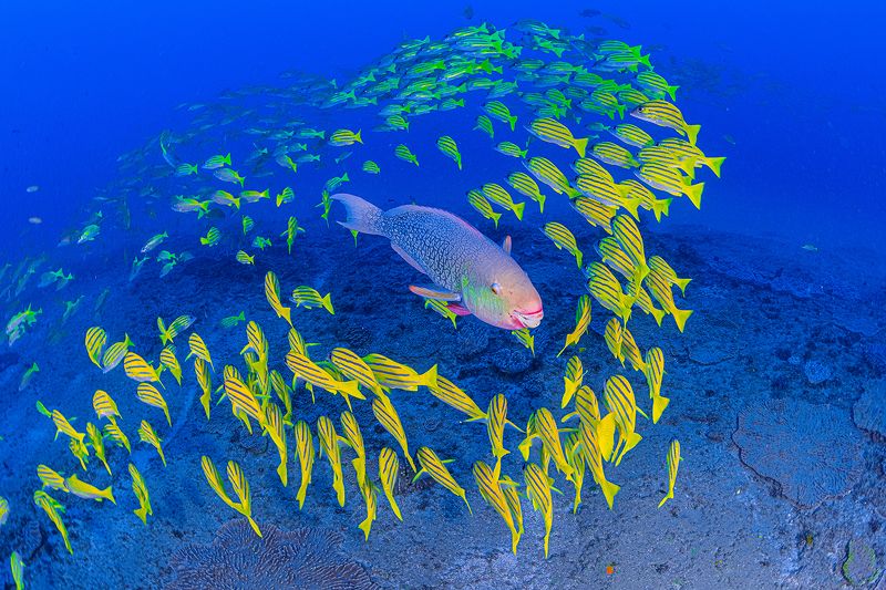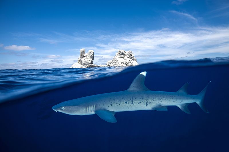 Roca Partida is a little rock out in the middle of nowhere. Part of the Revillagigedo Islands, it lies about 70 miles west of Socorro and 85 miles from San Benedicto Island. The tiny pinnacle jets up from hundreds of feet of water. Topside the two points make a comfortable home to the booby birds and gulls who have made their way here. Underwater it is a magnet to giant manta rays, whale sharks, schools of hammerheads, dolphins, white tips, Galapagos sharks, humpback whales, large schools of jacks and tuna.