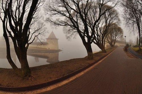Россия. г.Псков. Плоская башня окольного города Псковского Кремля в устье р.Пскова и реки Великая.