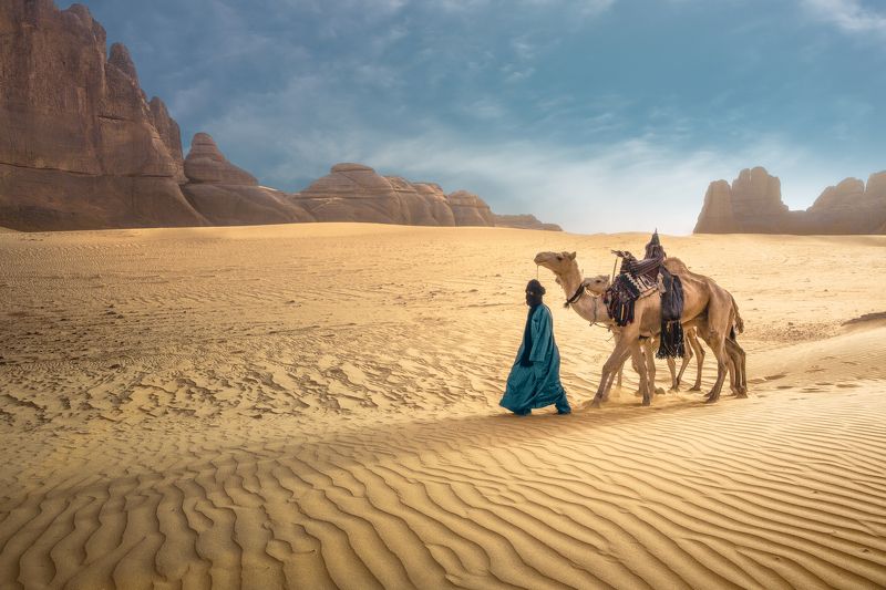 I taken this photo in Sahara "Tamanrasset " south algeria for a man " Touareg" or Amazigh of the desert , And they are also called : " bleu man" because they are use bleu in clothes ... And they also say that the blue color relieves fatigue , They are considered to be nomads Where they settled in the Great African Sahara (Stretching between Algeria, Libya, Mali, Niger and Burkina Faso) ,They're speak the Berber language , they were travel with their caravans It consists of herds of camels For trans-Saharan trade Transporting goods especially gold