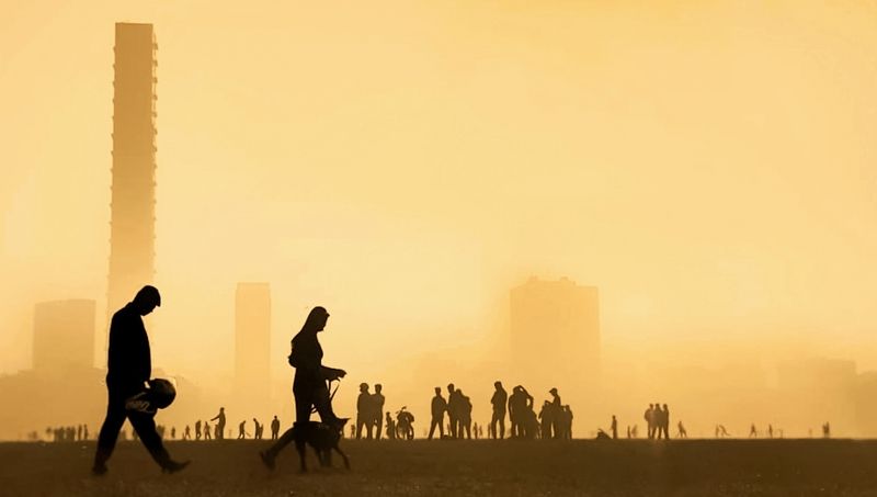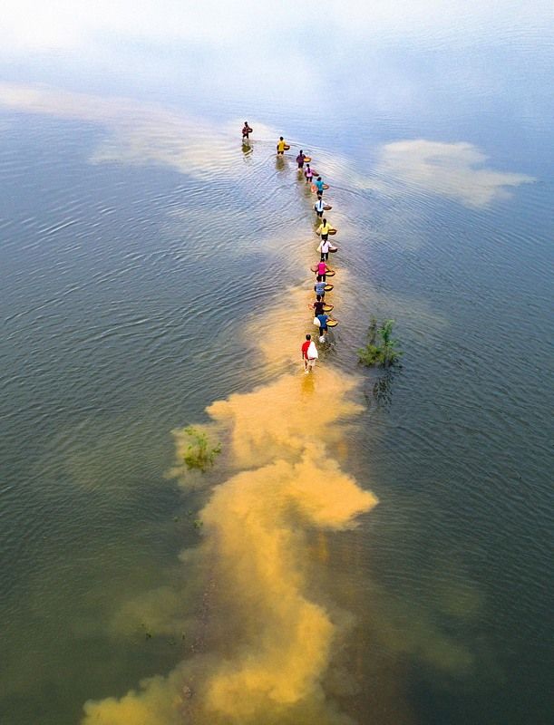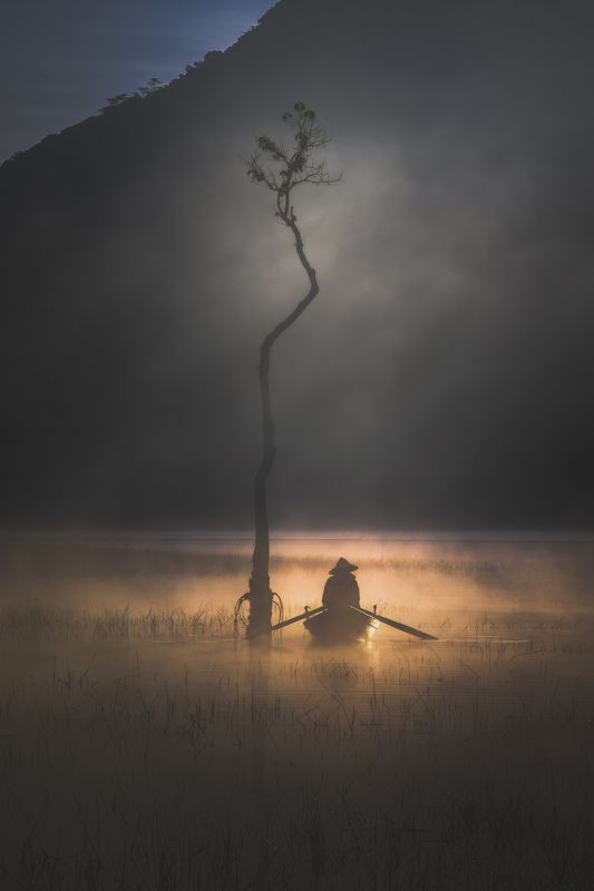 This is a Photo from a Winter Foggy Morning of Kolkata, India. The Fog was so immense that the iconic bridge of the City - Howrah Bridge that is situated on the River Ganges has got lost in it . A water carrier is on his duty of filling water from the river and carrying it back to his customers is surrounded by the flying pigeons , which in return has given the frame an beautiful Moment.