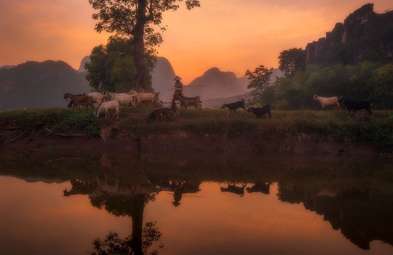 In a late summer sunset, I was wandering with my friend to survey a new location when I came across the image of a goat herder. When sunset falls, it is time for the goats to descend the mountain and return home. So peaceful and natural!