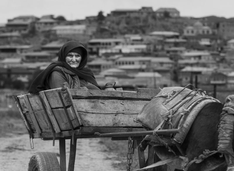 По пути в керамический цех я встретил необычный экипаж. Через центр села старик вел ослика, впряженного в старую самодельную телегу. А в ней важно сидела бабушка-горянка. Стало ясно, что керамический цех пока подождет. Взяв "на прицел" эту компанию, сопровождал стариков всю дорогу. Пятясь спиной к улице, иногда оглядывался, чтобы не влететь куда-нибудь. Так, снимая на ходу, и проводил стариков до их огорода за селом.