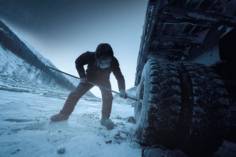 Фото снято в минус 50 градусов по Цельсию. Чамалгинская труба. единственная тонкая ниточка снабжения северного региона. Каких то 120 км опаснейшей дороги между Чамалгинскими хребтами по реке Индигирка делают эту дорогу уникальной по своей красоте и опасности. На фото водитель большегруза который умудрился вытащить из ледяного плена несколько машин. Невероятная Якутия.