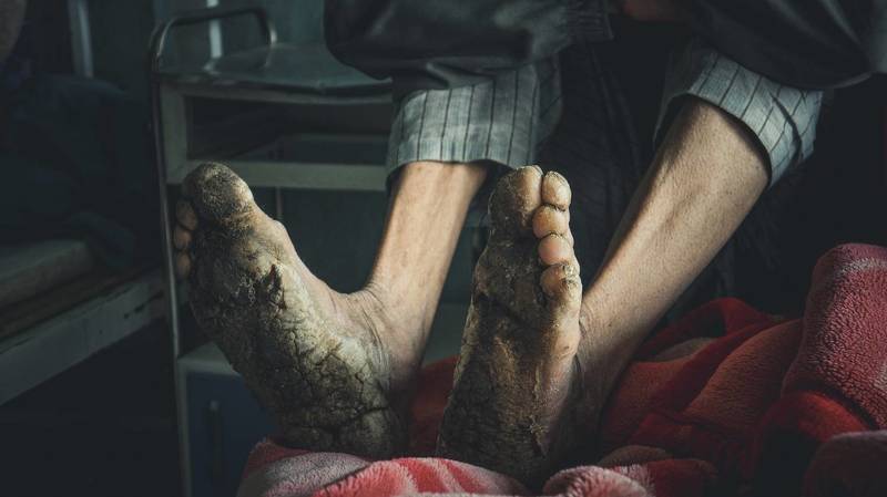 Chighel Mohammad 53y since 30 years he is using heroine when he was a labour in Iran Taliban bring him to hospital to cure him, doctors are unable to cure his feet in Kabul past government was going to send him for cure to India but when Afghanistan fell into hands of Taliban everything ruined and even he was unable to walk.