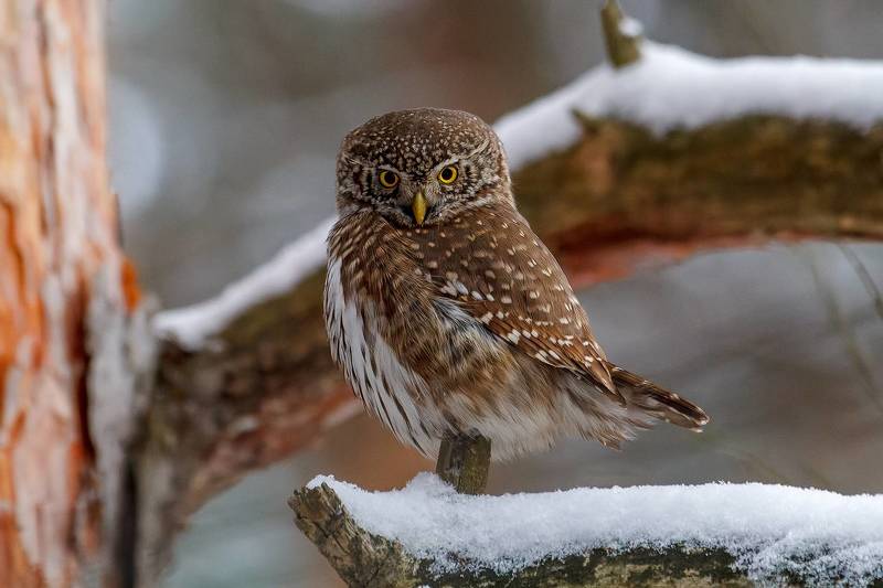 Воробьиный сыч осматривает свои владения. Охотился за большими синицами.