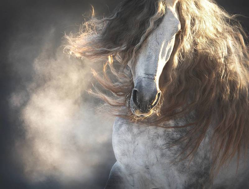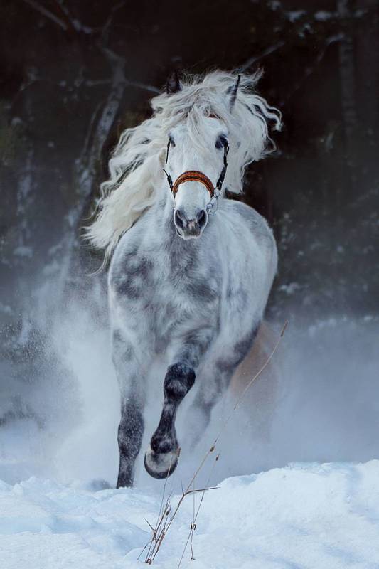 испанский жеребец скачет по снежным полям, крупный план