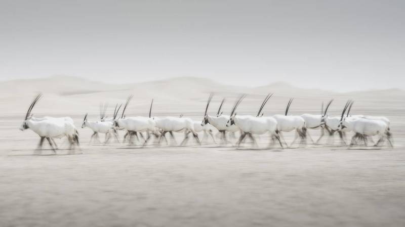 Herd of wild Arabian Oryx in the deserted of the UAE. Taken on a slow shutter speed to show the movement of the herd.