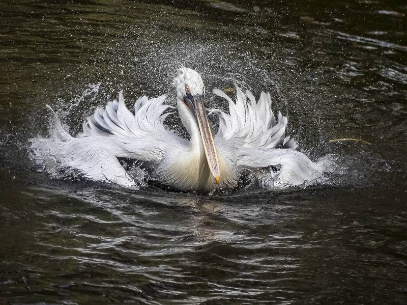 Купание кудрявого пеликана. Московский зоопарк, октябрь 2022