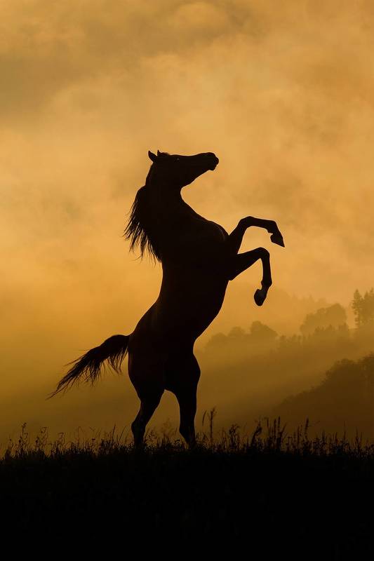 Арабский жеребец на дыбах на рассвете на горе.