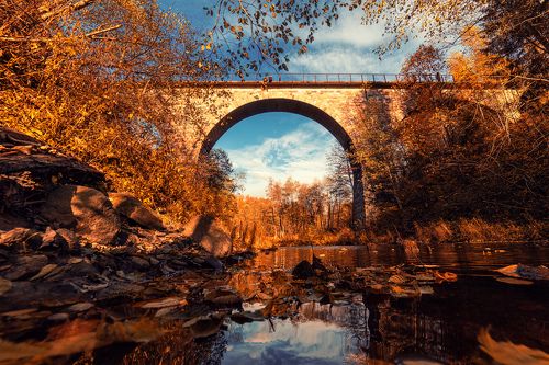 Каменный железнодорожный мост через реку Ярынья. Во время Первой Мировой Войны в Российской Империи существовало несколько стратегических проектов строительства железных дорог, проходящих через Великий Новгород. Одной из таких дорог была Нарва - Луга - Новгород - Валдай. Ее начали строить в 1914 году, но довольно скоро забросили, практически сразу после подписания мирного договора с Германией. Но частично эта железная дорога всё-таки была построена, в частности ветка "Крестцы - Валдай". И именно на этой ветке находится один из самых старейших и красивейших железнодорожных мостов в России. Высота моста 18 метров, примерно как у 6-ти этажного здания. Находится это место недалеко от трассы М-10, рядом с деревней Ярынья. Для того, чтобы попасть к мосту нам нужно съехать с трассы и поехать по направлению к деревне Колокола. В месте, где дорога пересекает рельсы выходим и идём пешком. Некоторое время эта ветка была действующей, но вот уже более 25 лет здесь нет пассажирского сообщения, а последний поезд здесь прошёл в 2006 году. Часть рельсов растащена на цветмет. Речушка, через которую перекинут мост называется Ярынья. Она впадает в реку Полометь, а вместе с ней - в озеро Ильмень.