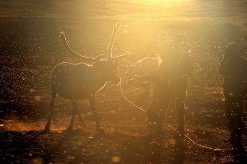 Олени и оленеводы на закате в разгар комаров