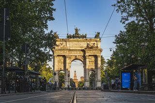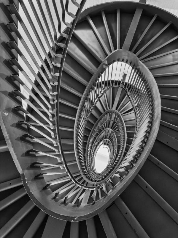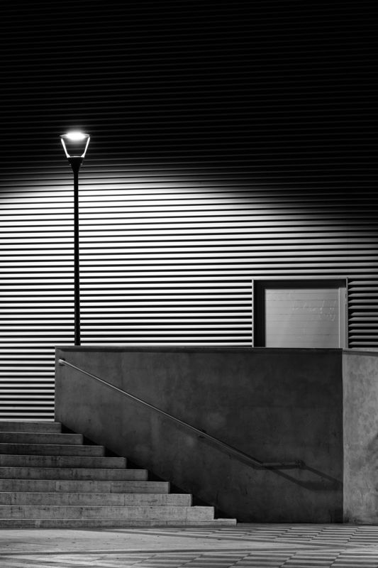 This photograph seamlessly blends fashion and architecture, creating a striking interplay of light, shadow, and geometric lines. The graphic composition enhances the dynamic feel of the frame, where the silhouette of a woman in an elegant black outfit becomes an integral part of the urban landscape. She confidently strides up the stairs, transforming the city into her personal runway. This image embodies style, energy, and the power of the modern woman.