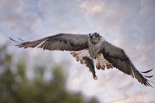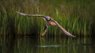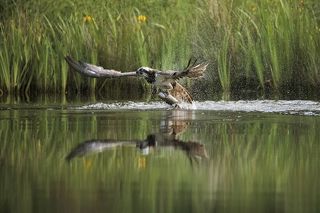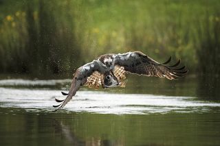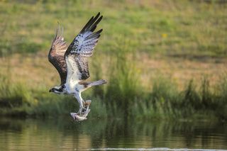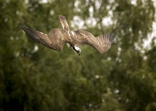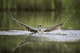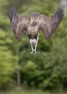 The only bird of prey feeding only with fish. Its precision and speed is stunning, the capacity of spotting a fish through the water is amazing. The dive is often almost a vertical descent at high speed, talons out and straight in front of it. The rise from the water often seems a struggle, the weight of the fish bringing the bird down, but most of the times it's more of a meticulous action to sense the correct direction of the wind for an easier lift off. And up! It flies back to the nest.