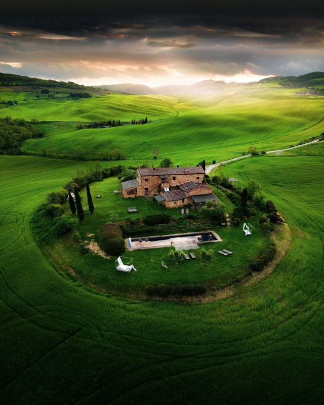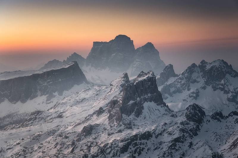 The Italian Dolomites, realm of natural majesty, unveil their full splendor at sunset from Passo Giau. From above, the drone captures the magical moment when the sun dips below the horizon, painting the endless sky with warm hues and caressing the towering peaks with a final golden touch. Here, among the time-carved summits, peace and freedom blend into perfect harmony, while the soul is filled with wonder in the face of nature's grandeur.