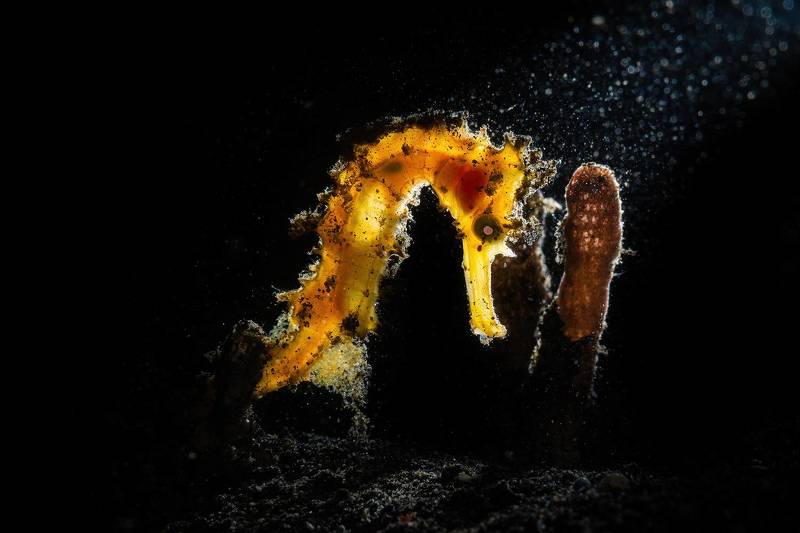 Indonesia - Lembeh Strait: during an afternoon dive I encountered a yellow seahorse attached to a branch of hard coral, I photographed it using only a snoot flash at an angle that gave backlighting creating a snowfall effect