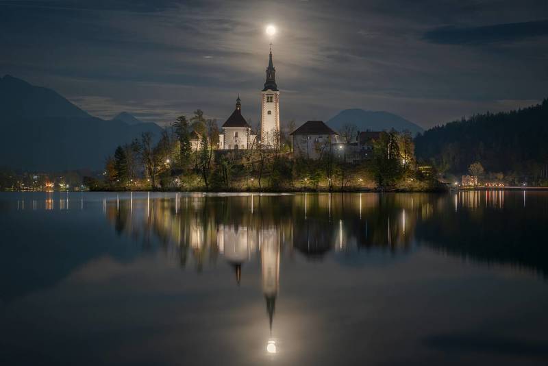 The bell towers rise against the darkness, outlined by ambient lighting that caresses them gently, highlighting their imposing presence and architectural grace.