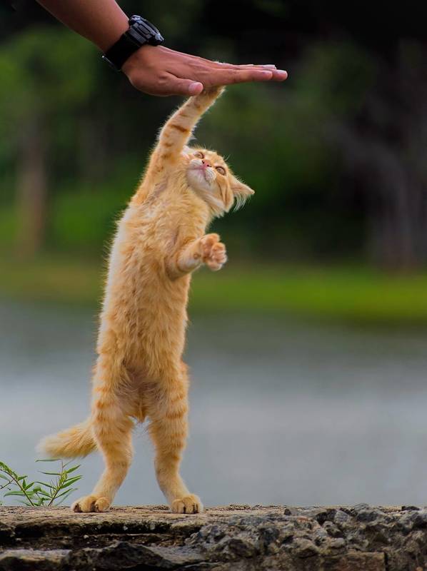 In a quaint corner of my backyard, I witnessed a whimsical moment that left me utterly charmed. A mischievous kitty, adorned with fur as soft as a cloud, decided to break the monotony of the day by performing an extraordinary feat. With a gleam in its eyes, this feline dynamo lifted both its legs in the air, offering a spirited high five that seemed to defy gravity. It was a gesture so full of joy and spontaneity that I couldn\'t help but grab my camera to capture this delightful rendezvous with a four-legged acrobat. The result? A photograph that encapsulates the sheer magic that animals bring into our lives, reminding us to celebrate the simple joys and embrace the playful spirit that surrounds us every day.
