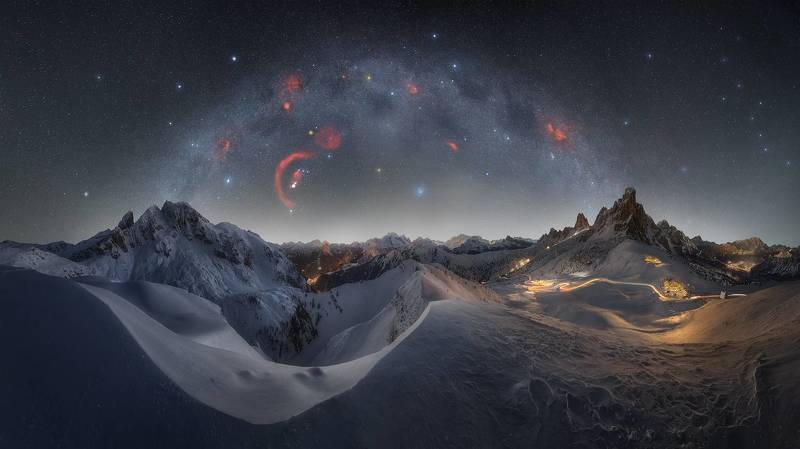 I want to close this 2023 of strong photographic growth for me with this work which is certainly the most complex I have ever created and probably the most beautiful and desired. We are at Passo Giau on the night of December 15th. Temperatures around -8 degrees with a lot of wind (definitely lower perceived temperature). It was an overview that I had dreamed of doing for a long time and I finally succeeded. There is approximately 300° of field of view, it is the result of a panoramic view of 10 rows for the base and the same number for the sky. For the base I also performed a multi-exposure in various parts of the panorama plus a series of shots for the trails. There were so many difficulties but in the end I brought home a result that I really like.