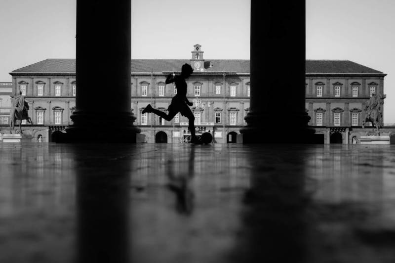 July 2023, Neaples, Italy. A boy plays football under the porticoes of the church dedicated to "Saint Francesco di Paola", situated in the main square of the city of Naples. In the background you can see the facade of the main entrance of the Bourbon royal palace (UNESCO heritage). The boy is doing a counterattack by running towards the opponent's goal. Street football is an integral part of Neapolitan and Italian culture. These kids are often called "street urchins". It is an activity that has always been practiced and has never stopped.