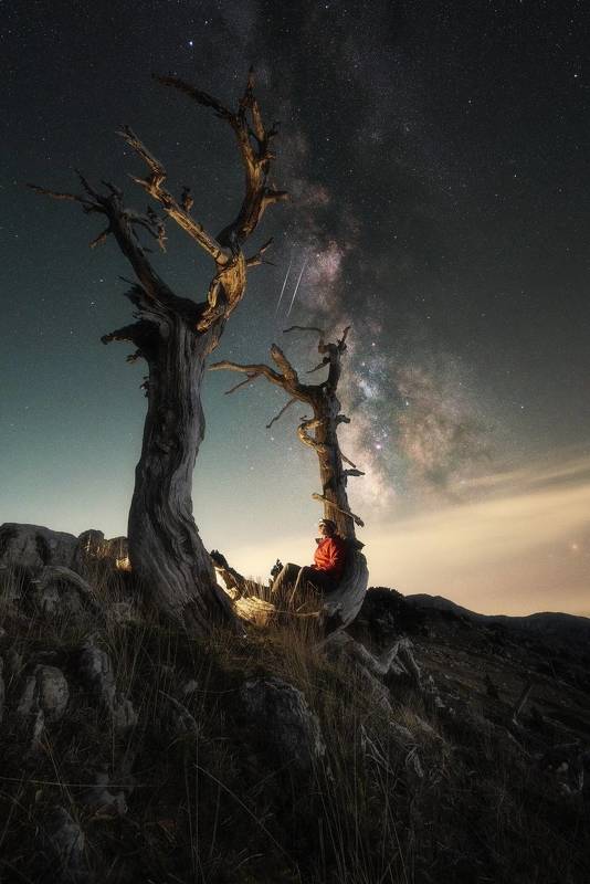 After finding these two trees I shot the foreground during blue hour and after dark I took the tracked shot for the milkyway