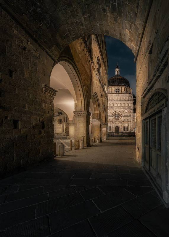 Imagine standing on an arch of the Palazzo della Ragione in Bergamo on a clear night. As you gaze towards the Basilica of Santa Maria Maggiore, what unfolds before you is an image of sheer beauty.