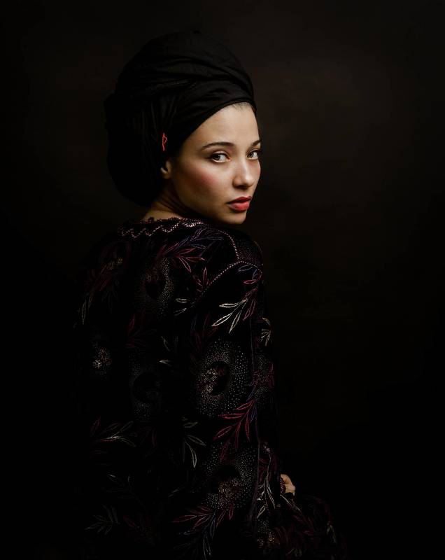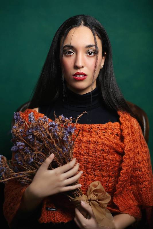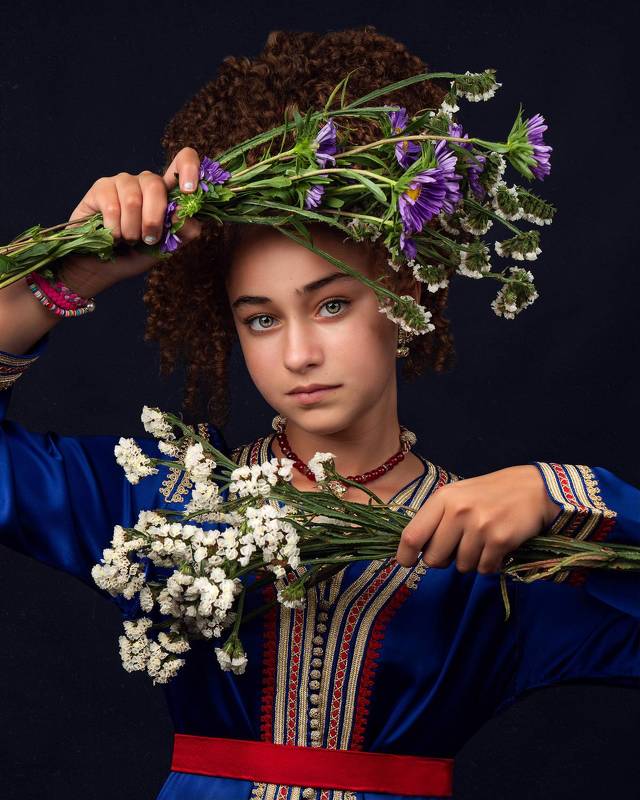 In this portrait, a young girl. soft lighting highlights her natural beauty. The warm background provides a beautiful contrast to her cool blue eyes. This portrait captures a serene and captivating moment.