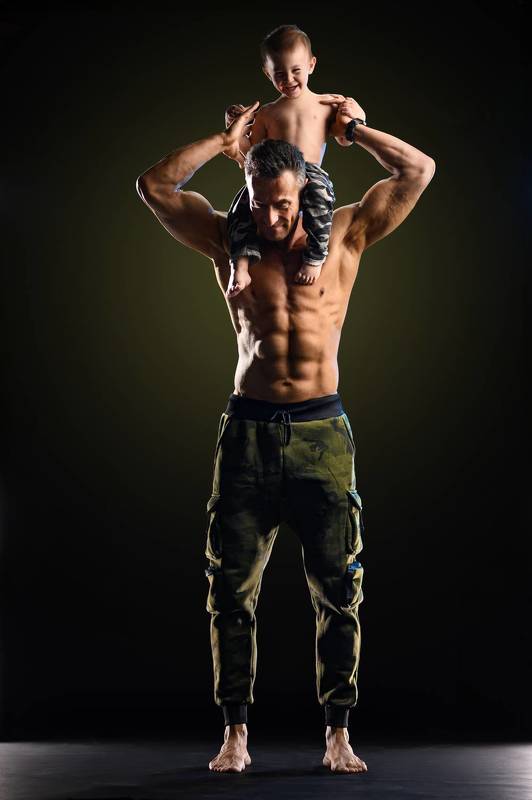 Ova fotografija uhvata oca koji izgleda kao stup snage, sa svojim detetom trijumfalno smeštenim na njegovim ramenima. Dete, koje širi ruke sa osmehom, izgleda kao da je osvojilo svet, dok mu očeve snažne ruke pružaju oslonac. Postavljeni protiv tamne pozadine, očeva mišićava figura i detetov razdragani izraz lica su u centru pažnje, simbolizujući sigurnost i radost koje proističu iz ove bliske veze. Fotografija izražava koncept visokih dostignuća i snova koje roditelji imaju za svoju decu, kao i ideju da su roditelji temelj koji im omogućava da se uspnu visoko u životu.