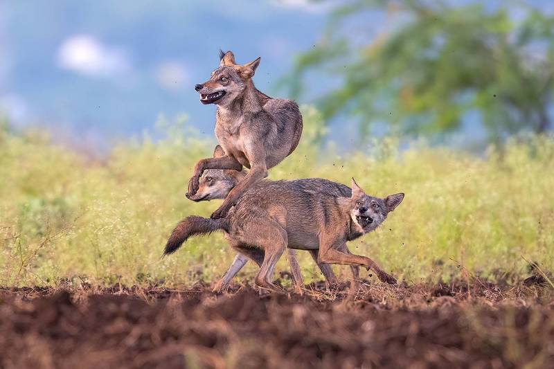 My pursuit of the endangered Indian wolf led me to a small village near Bhigwan, in the Indian state of Maharashtra, called Kumbhargaon. I learned from the local residents that a few wolf packs were frequently spotted near the agricultural fields in the area. I decided to establish a camp there and spent the following days closely following these packs. On one memorable occasion, I positioned myself in a rut created by farm tractors near a freshly tilled field, aiming to capture the wolves at eye level. It was during this time that I observed three sub-adult wolves engaged in playful interactions. That is when I decided to capture a few action shots to show how boisterous these amazing creatures were.