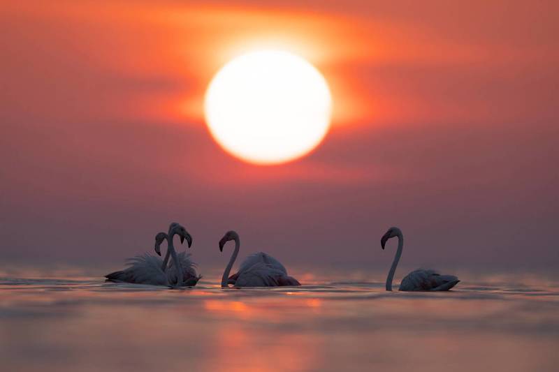 This image was taken at Asker coast of Bahrain. A flock of greater flamingos were wading with dramatic sun at the backdrop. The eye level shot has given a dramatic perspective.